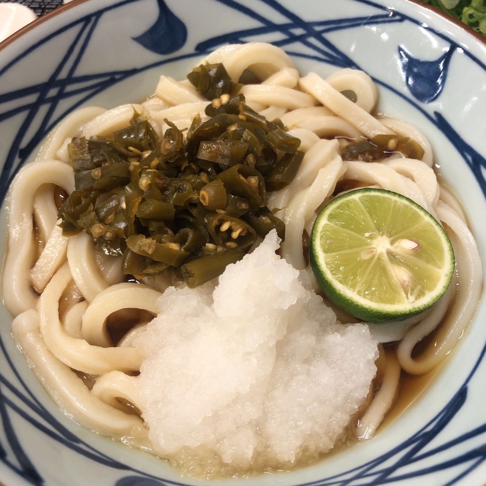 丸亀製麺に激辛うどんがあるとは知りませんでした❗️青唐辛子がピリ辛で、すだちでさっぱり👍暑いこの時期にピッタリなうどんでした👌出来れば、もう少し青唐辛子を盛ってくれるとなお良かったかも🌶️とても美味しかったです♪