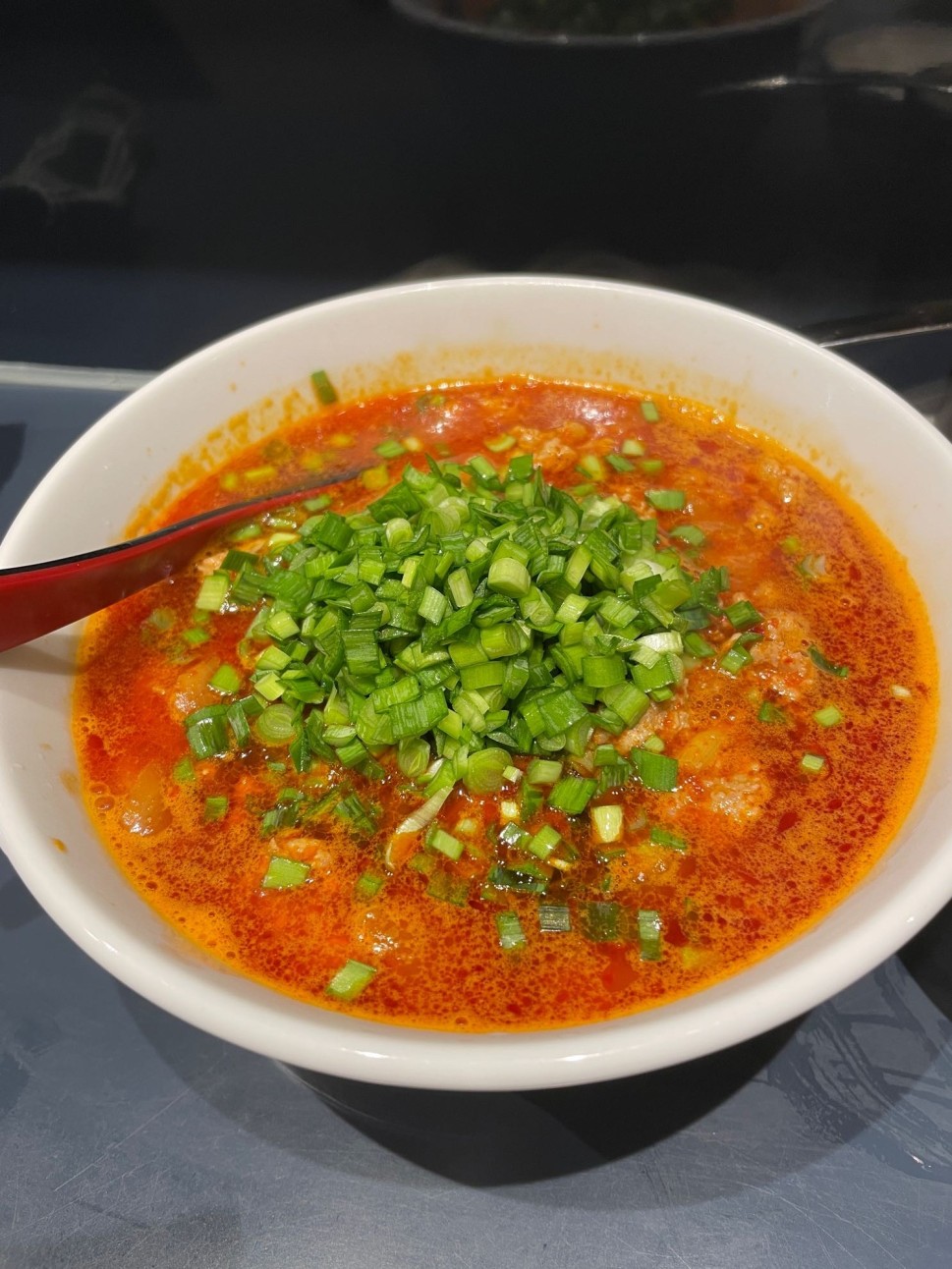 ラー油に染められた真っ赤なスープはじわりと汗かく辛さです