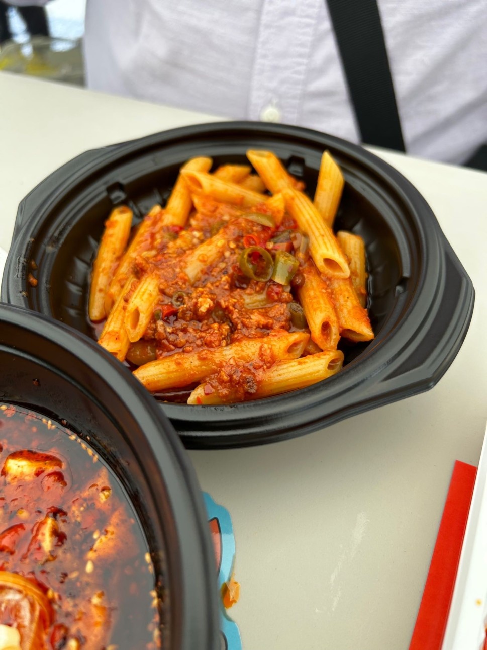 ペンネはちょっとアルデンテっぽいけど、もうちょっと工夫が欲しいかな?屋台だから仕方ないのかな?辛さはそこそこ🔥辛さの方向が他のお店と違うので、ジャッジが難しいけど、むちゃ辛でこれくらい(1.8KM)かな?