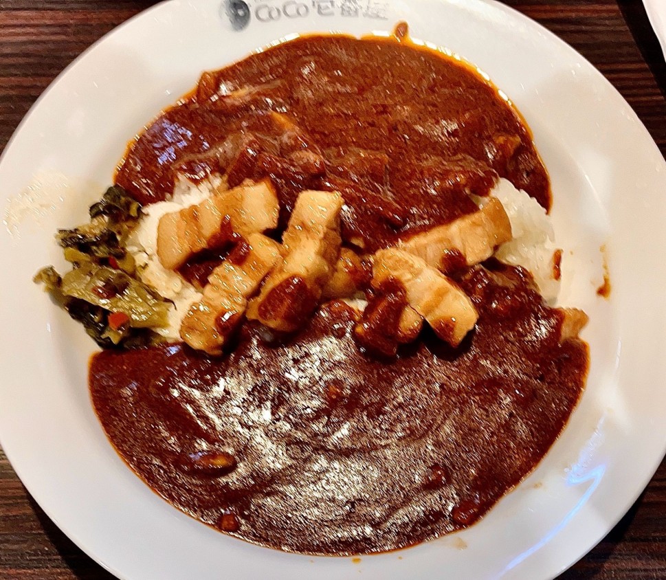 椎茸とは伏兵😊 20辛はどろりと粘度を感じる見た目ですね。ライスを少なくしたら吸われて見えなくなってしまったりして😅