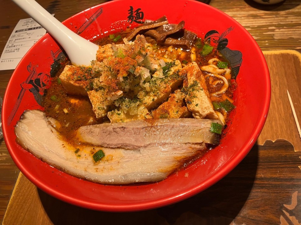 さて10分ほどで到着。ラーメンに揚げた大型の六面体サイコロサイズ(微妙な表現?)が乗り、手前には大きく細長い一枚肉、奥には漬けたメンマかな?ネギと赤い粉がまぶされ、スープはもちろん真っ赤。期待大です。