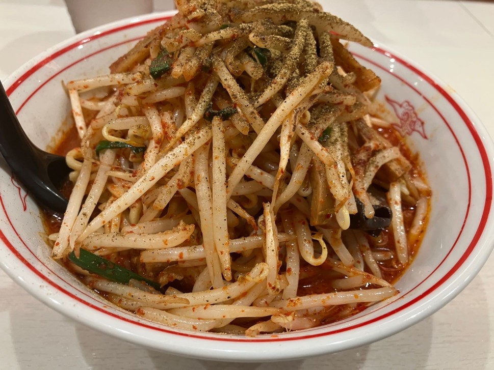 赤いスープに山盛りのもやし。もやしにはたっぷり胡椒がかかっていて、そのためか(?)スープの辛子のトロみが少ない感じ。スープだけ一口いただく。むせるほどの辛みはなさそう。なるほど、だから皆さんが何倍等の調整(?)の注文をしているのね。