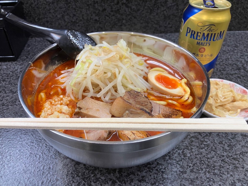 参考ですが、今回食べられなかった紅蓮つけ麺は、旨辛→鬼辛→本気辛(¥100増)という辛さ段階でらーめんとは違うので、味も違うかも。缶ビール¥450はプレモルの350缶で小皿ツマミが付きます。スープも麺も残らず美味しく頂きました😋