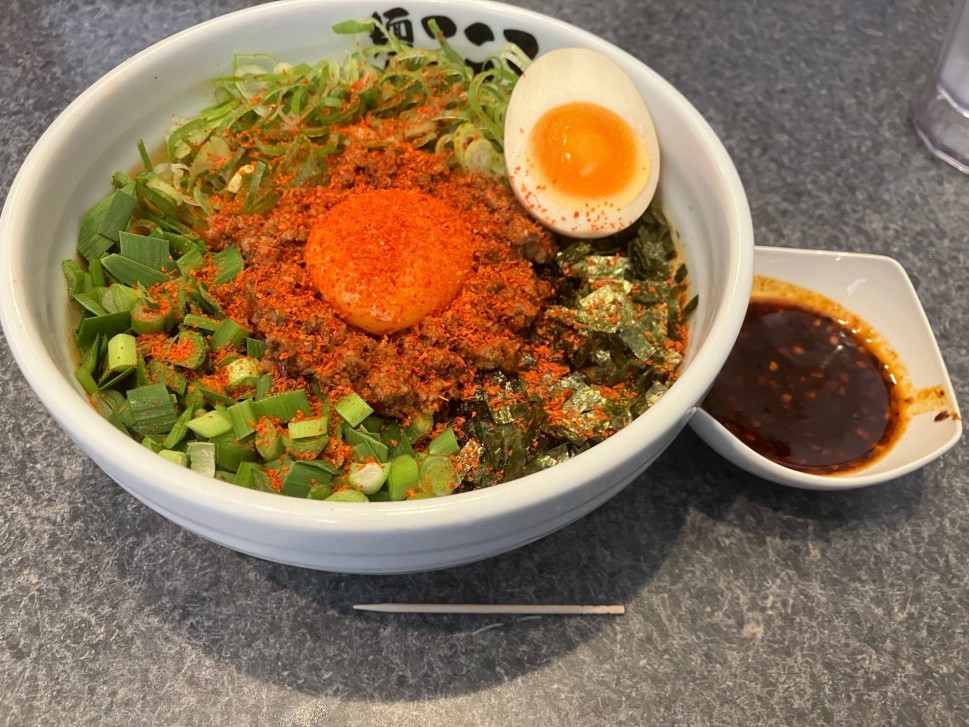 極辛台湾まぜそば¥1,000の旨辛(¥50)1枚増を頂きました。外観は外側からネギニラ刻みノリ、内に挽肉、中心に卵黄で、全体的に赤い粉が振り掛けられており、前回食べた増し無しの極辛と大差なく見えます。旨辛は別皿で赤い液体として登場しました。その別皿を足しても前回の方が辛く感じました。体調や唐辛子🌶️慣れなのか?それでもCoCo壱10辛よりは辛いんじゃないかな🧐 別皿の液体を直接食べてもみましたが、目立つ辛さではありませんでした。