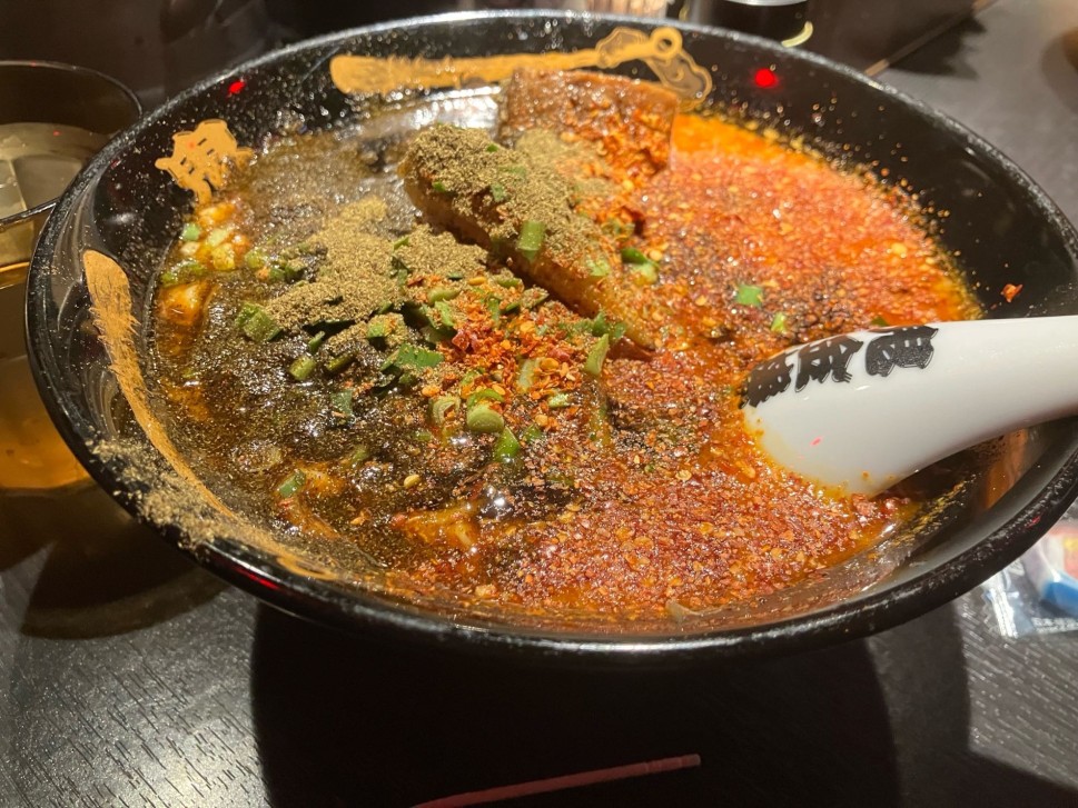 左半分が痺れの黒、右半分が辛い赤と火鍋のような外観。