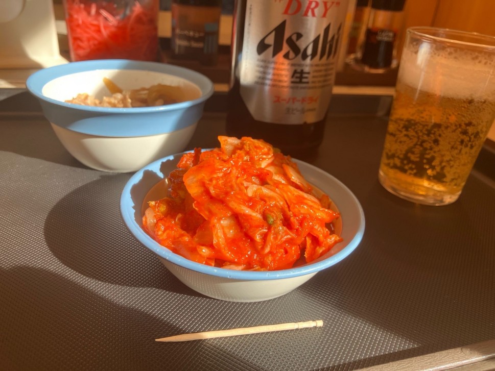 ビールのおともに富士山キムチ¥100を。特別に辛いとは思いませんが価格¥100とピリ辛が嬉しい😃 一切れ(?)ずつチビチビ頂きます。サイズ感は画像の爪楊枝や中瓶ビールを参考にしてください。辛さはカラムーチョ級か、ちょい上かな 【2025年2月】