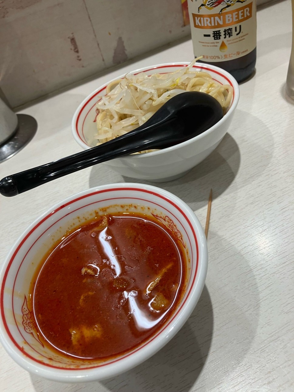 半ラーメン瓶ビールセット¥1,070で頂きました。辛さ3倍を頼むのをまた忘れた…。冷たいせいか北極よりマイルドに感じますが、美味しく頂きました。【2025年10月】