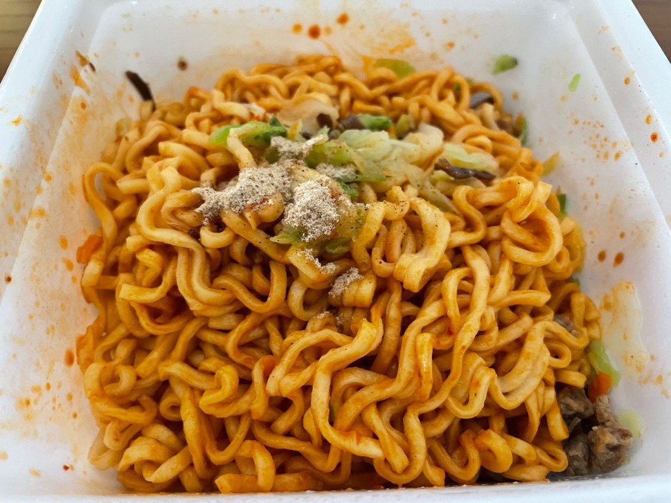 苦手な人が食べても美味しいと思える甘味の強さ。最初に、何これ甘すぎっ!と思える強い甘味が来て、あとからちゃんと辛みがやってくる、という感じ。麺がもちもちで美味しかった。辛味が好きな人は追いとうがらしを用意しておくといいと思います。