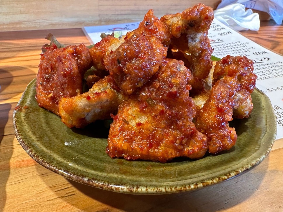 メニューには激辛とありますが、マイルドな辛さの鶏皮揚げです。