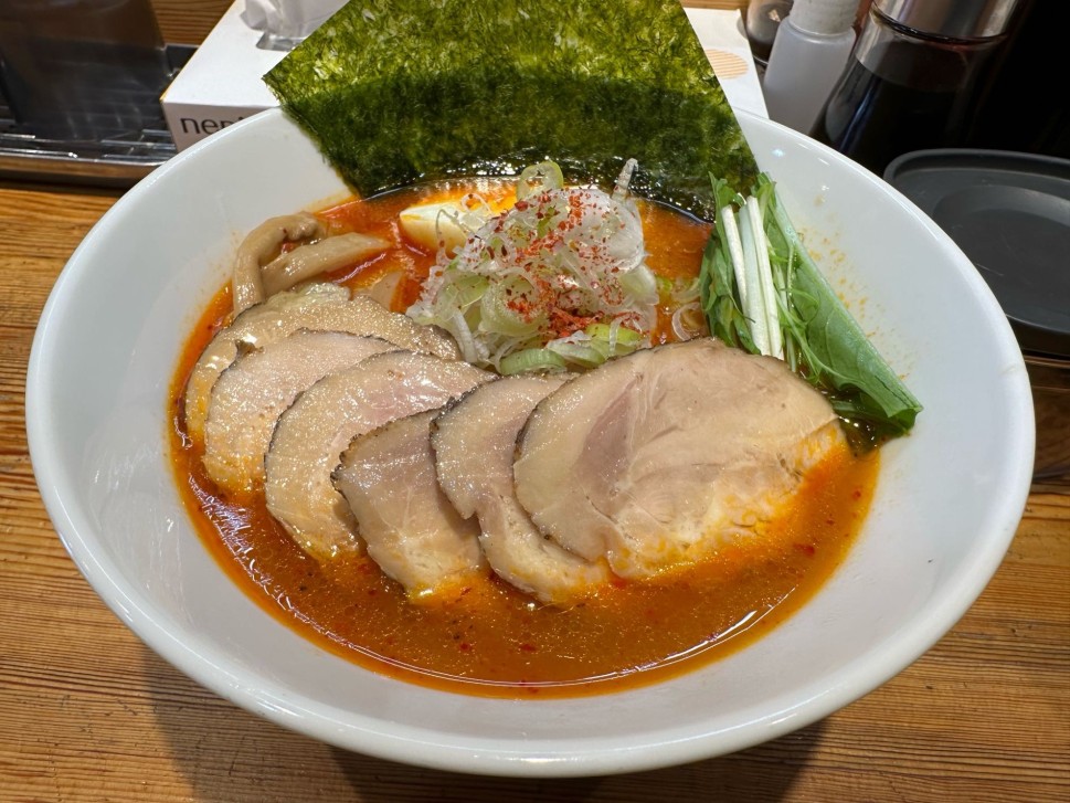 チゲ鍋のような甘辛いスープがツルツルの麺によく絡みます。近辺では珍しい24時間営業のお店で、朝からラーメンが啜れます。