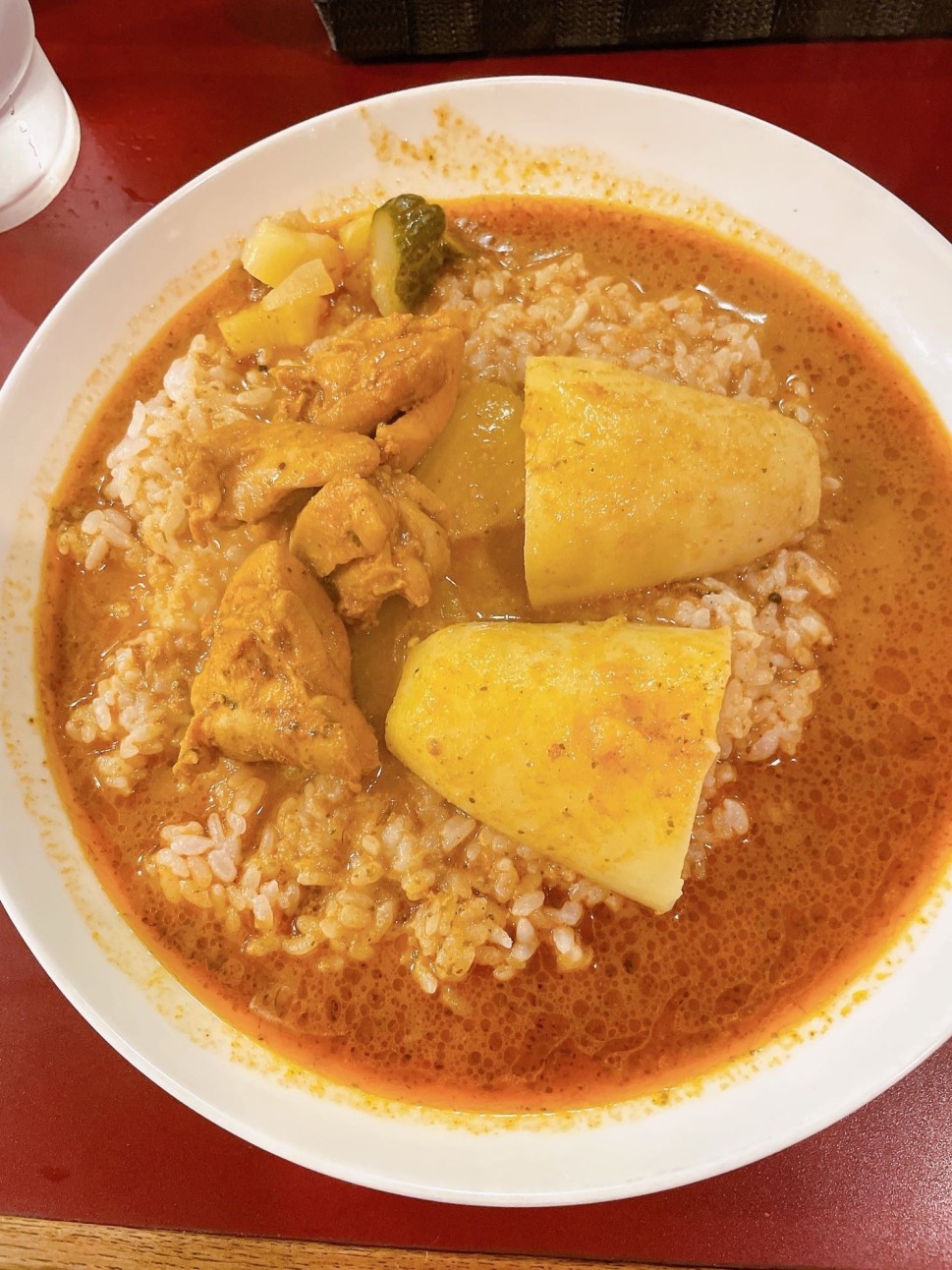 ご飯に直接インド系のカレーがかかっており、具材は大きなジャガイモが二つとチキンが4~5個入ってます