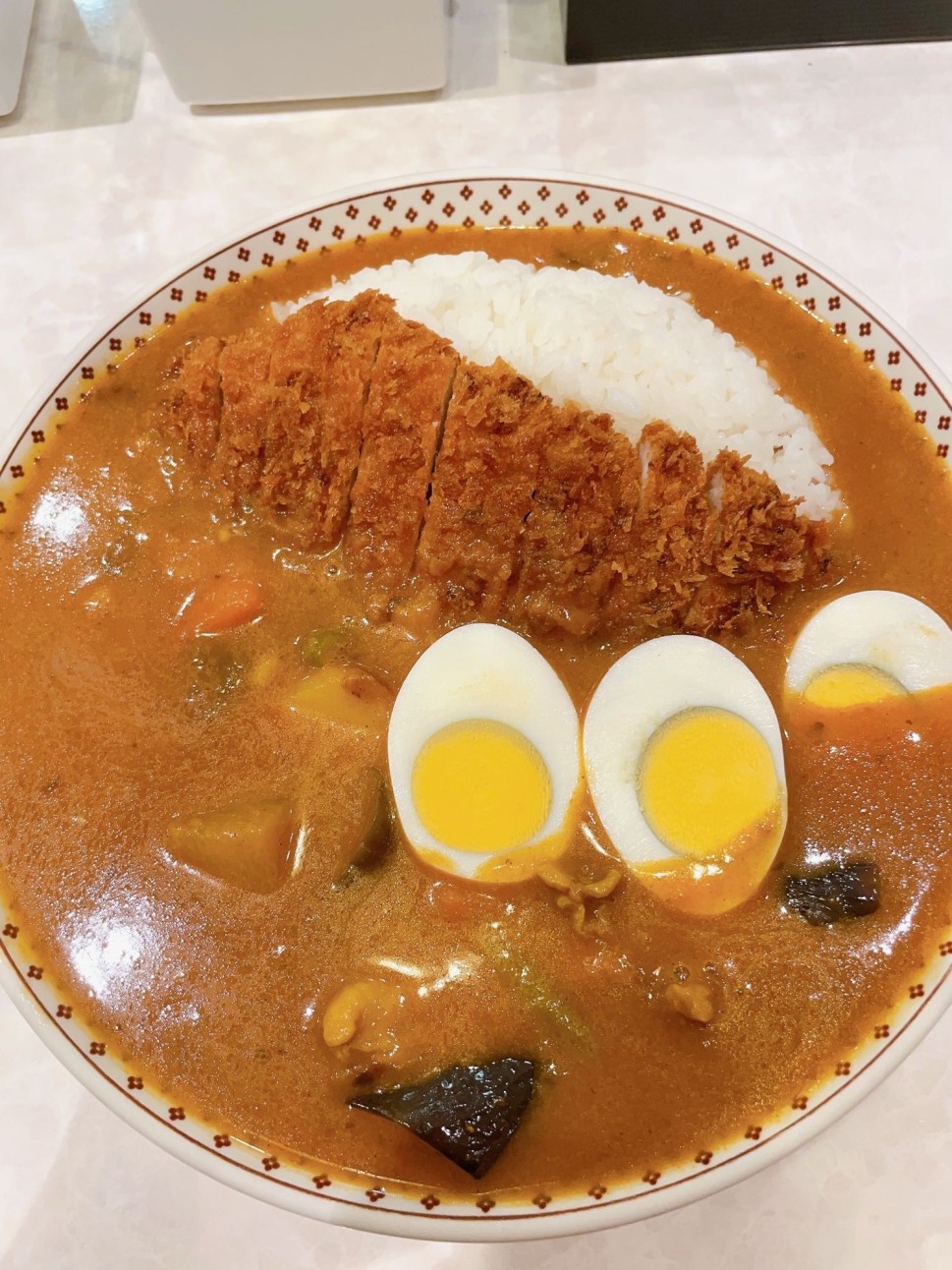 スタミナカレーにカツ、ゆで卵、辛口トッピングで注文