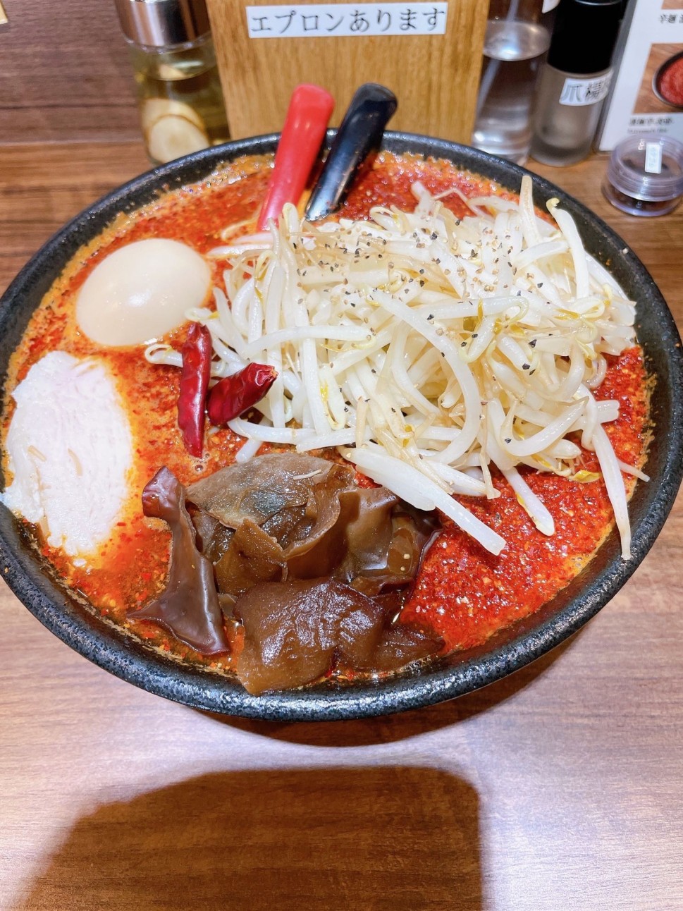 唐辛子の辛さがパンチのあるラーメンで鶏胸肉のチャーシューとキクラゲのトッピングがアクセントになり、美味しかったです