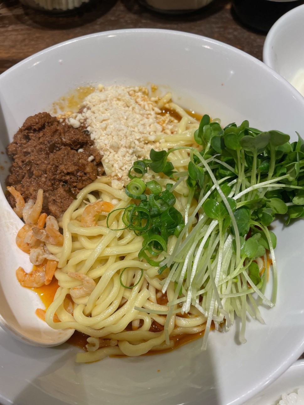 日式角煮汁なし担々麺(辛さ5・痺れ5)に温玉と小ライスを注文