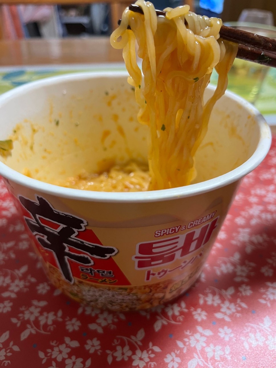 まさに辛くないクリーミーなブルダック!!レンジ調理でもちもち麺によく絡むからこれはおいしいー!