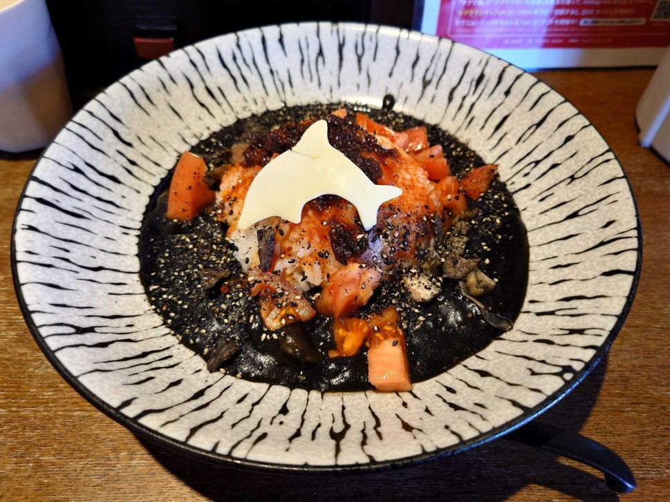 食用竹炭で真っ黒なマグマを表現したカレーに短く切った中華麺が入るカレー混ぜそばに初めから追い飯が入ったような趣