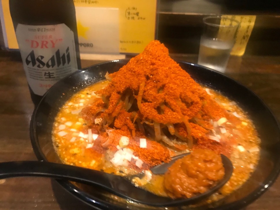 店主さんに「死神食べたいんですけどめっちゃ辛いですか、、?」て聞いてみると、「上の粉はそんなに辛くないので、レンゲにのってるのを少しずつ混ぜれば食べれると思います」とのこと!