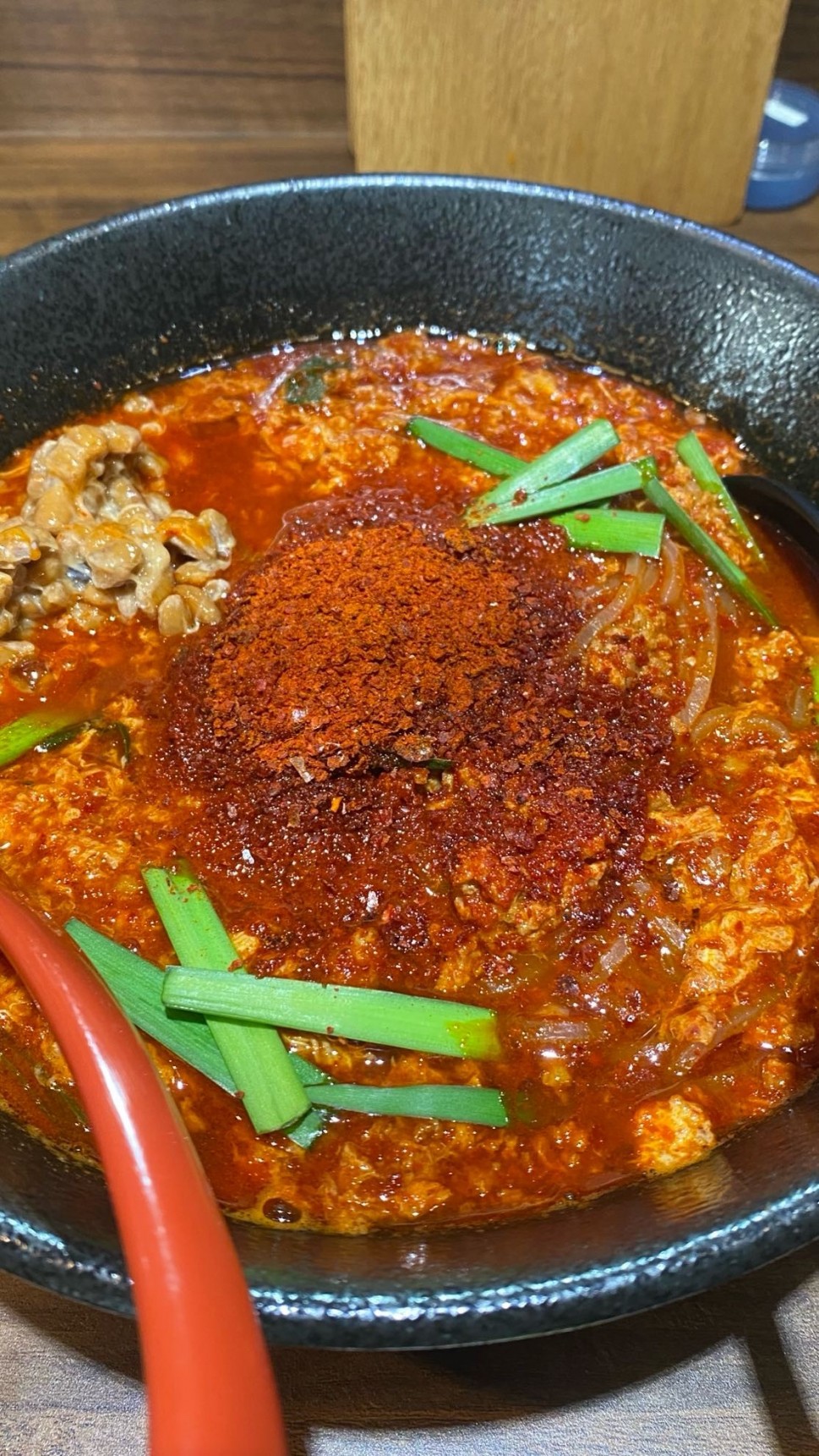 このメニューの上が“炎帝”なのですが辛さに結構開きがあるようなので、ヒヨって極辛を注文w 相変わらずスープもこんにゃく麺も美味しかったです!今回は納豆トッピングしました!前回、新宿で食べた煉獄よりスープが少なかったのか?かなりドロドロしてました…直営店との違いなのかメニューごとの違いなのかはまた通わねば分かりませんが、明らかに煉獄よりドロドロで、スープは減っていくばかり笑 もしこのドロドロがデフォルトなら汁好きとしては、追加料金でもスープ増しが出来たら嬉しいな…次回聞いてみます。