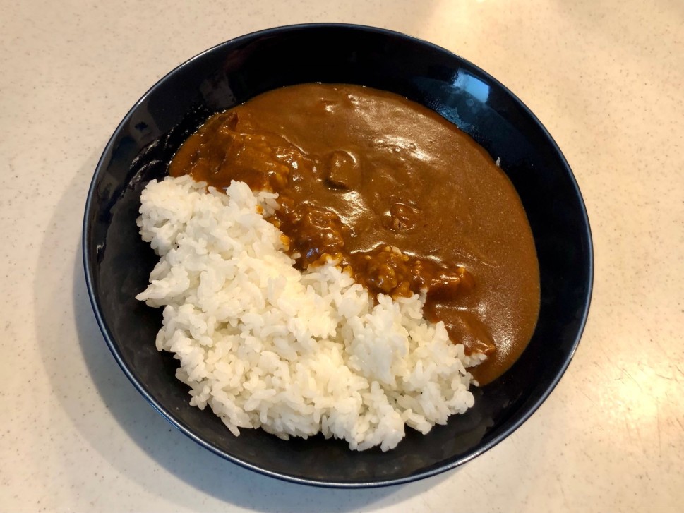 初めて食べたが、しっかり辛い。ビーフカレーの旨味、胡椒味?を感じた後、後からじわじわスパイスによる辛味のウェーブが来ます。ノンストップではややキツく、途中で小休憩を挟み、完食。食塩相当量は2.5gと控え目で良い。