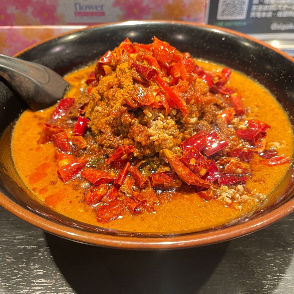 先日、地獄の坦々麺ヘリテイジを完食したので、とうとう、無限に挑戦する事にしました。17:25くらいに、大将に会い、ホントに食べるんですか?と入り口のところで、笑われながら、話をして、入店、先頭で入店で、恐らくバイトであろう人に、無限ですか?と聞かれ、大丈夫ですと言ってオーダー、6分程で着麺。その際に作っていた方が、身体を遠ざけるように、カウンターに置いたので、あぁやっぱりヤバいやつなのかな。と一瞬怯みました。