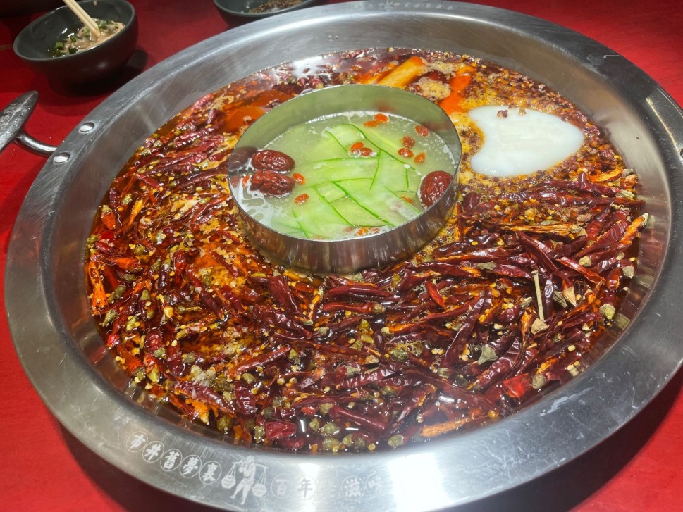 本番2色鍋 周りは激辛 真ん中は普通