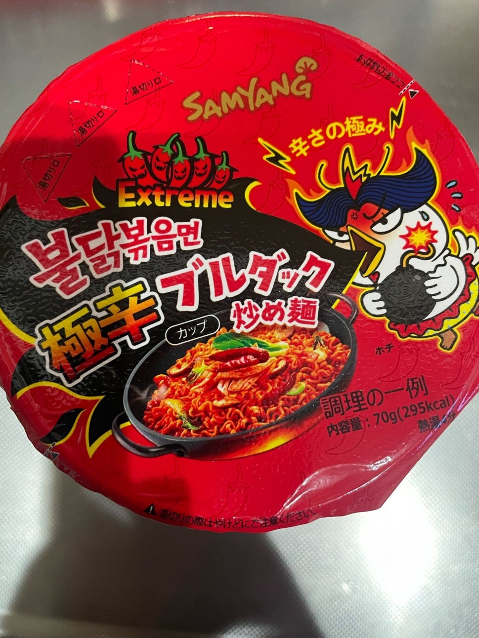 小さい方の極辛ブルダックにチャレンジこっちの方が量が少ないから余裕と思っていましたが、確かに完食は余裕でした。…しかし辛さはこっちの方があった感します。ちと完食後の余韻がヤバい。
