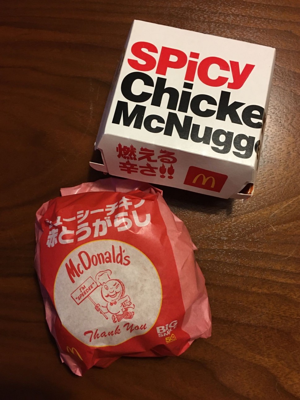 スパイシーチキンナゲットとジューシーチキン赤とうがらしバーガーをお持ち帰りで。