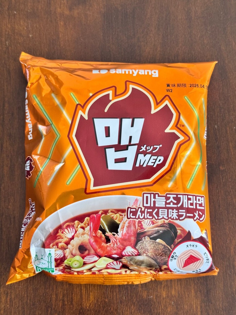 メップ(MEP)にんにく貝味ラーメンをいただきました。パッケージ通りニンニクと魚介が香る透き通ったスープ、一口飲むとすぐにピリッと舌に伝わります。あっさりはしてますがもちもちの太麺としっかり絡まり、キムチをつけ合わせましたがめちゃくちゃ相性いいです。辛さは足りなかったので追い唐辛子しましたが、あとは完成された味で工夫は不要でした。美味しかったです😊