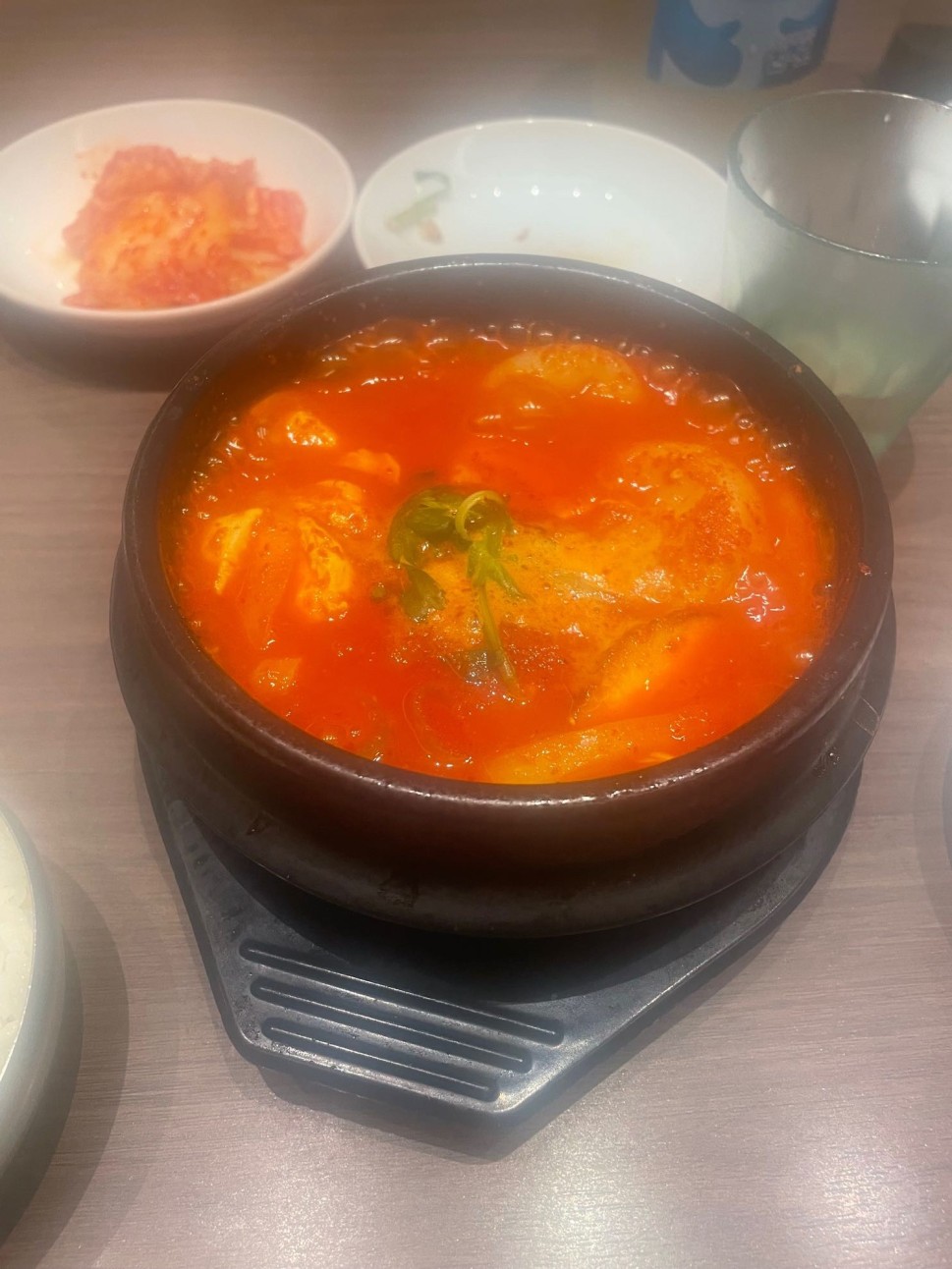 MAXの5辛。唐辛子が、じゃりじゃり口の中に残るほど入っている。キムチ、もやしナムル、チジミのおかず3種がついているのに1000円台と安め。辛いの好きな人なら美味しく食べれる辛さ!