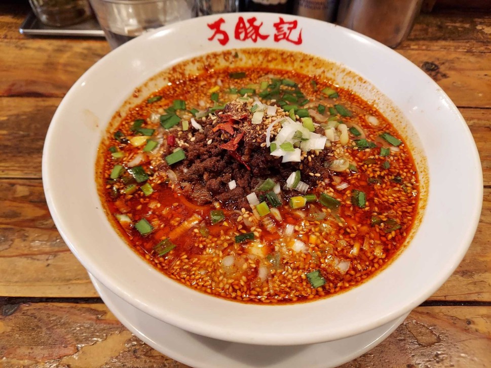 🌶🌶🌶🌶.見た目は赤いですが、見た目ほど辛くはなく、じわじわ暖まる優しさでした.麺が太麺モチモチで、散らばってる唐辛子も一緒に美味しく食べることが出来ます。出来れば山椒をばーっとかけたい。