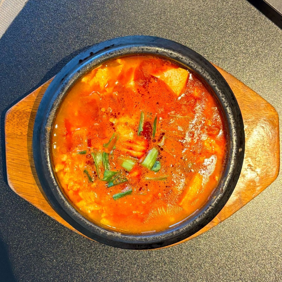 食欲そそられる鮮やかな赤いチゲスープは程よい辛さ。石鍋の中、激熱ですがガツガツと食べ進められます。実食中こそ辛さは徐々に蓄積していきますが、あまり後に残らず、適度に身体が温まります。具材は豆腐がたっぷり、半熟卵、えのき、ねぎ、あさり。そしてメインのチーズは熱々のスープの中でとろけています。見つけて口に運ぶ幸せ。辛さの中にも海鮮の旨味を感じ、あっという間に完食しました。激辛初心者さんにオススメできる辛さです。