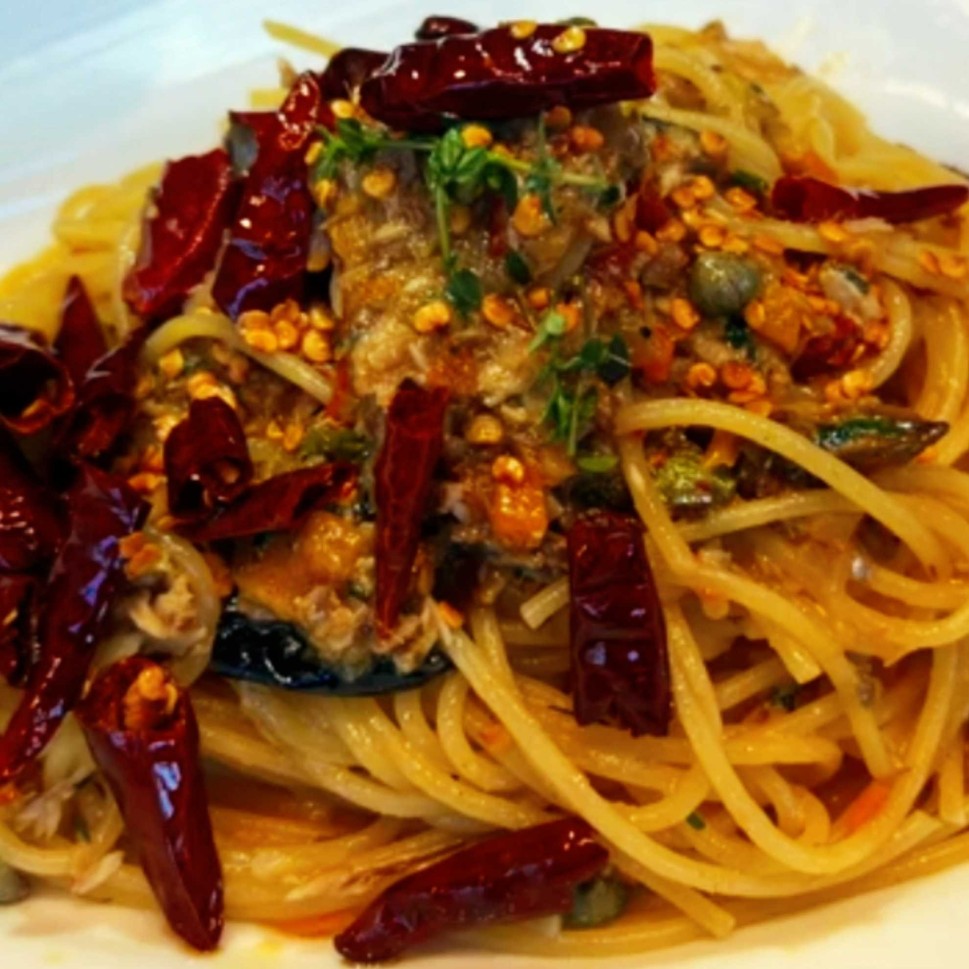 9月に食べた備忘録。辛さは、カプサイシンの辛さでじんわり汗が出る程度。しかし美味しい。鰯と香味が辛さと合っている。只パスタと具が絡みにくいかも。悶絶まではいかず、キャロライナリーパー等もっと足したい感じ。味はとにかく旨辛である。