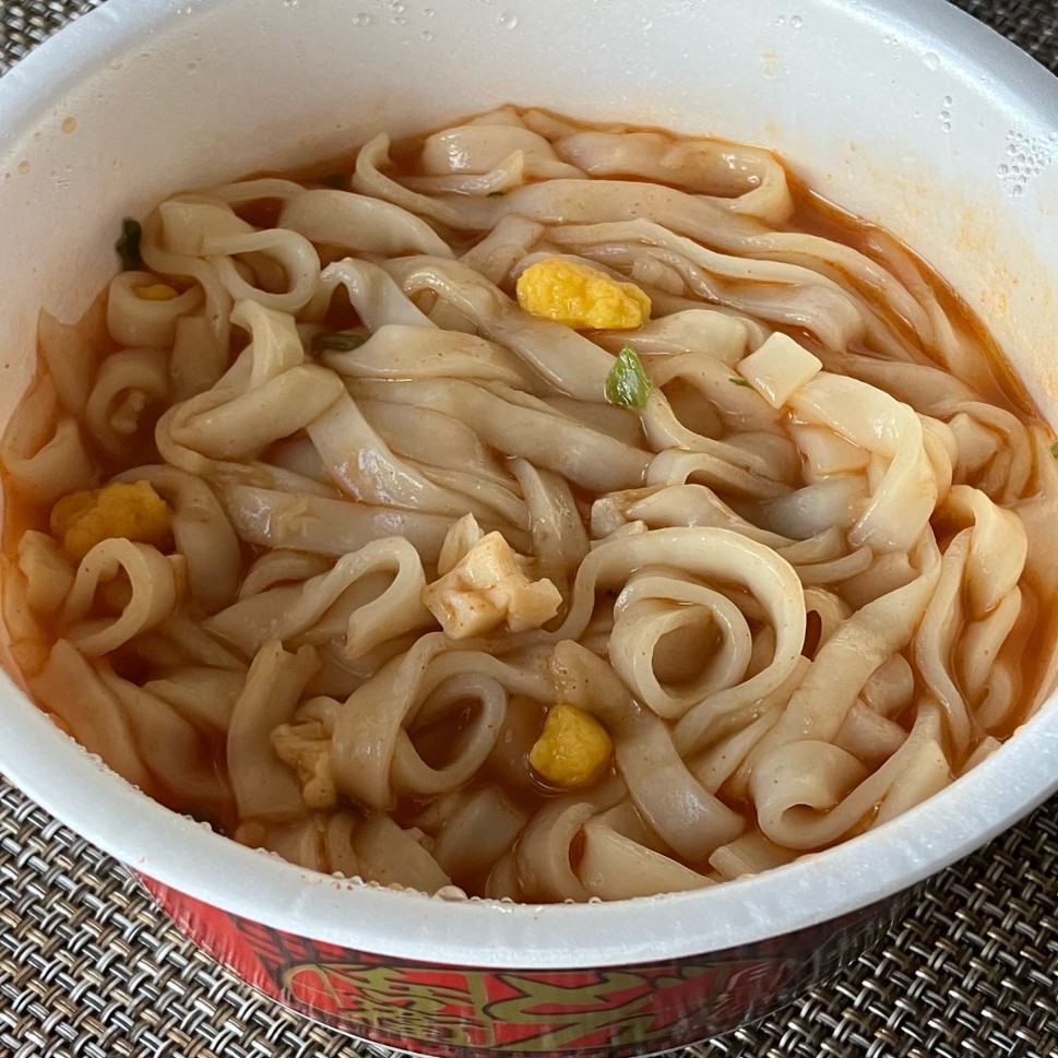 食べたそのものに辛みはさほど感じないけど、口や喉にしっかり辛さが残ります。魚介感じられておいしい。 余談ですが…お湯を入れてすぐに電話がかかってきて、お喋りしていて気付いたら50分経過。自分史上最長に置いたどん兵衛は、豆腐よりうどんの方が柔らかく噛まずに飲める程に優しい食べ物となりました(写真参照)。まさにスンドゥブ!おいしかったです。笑