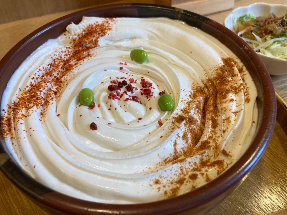 カレーうどんの上にクリームが盛られてます。おいしいです。