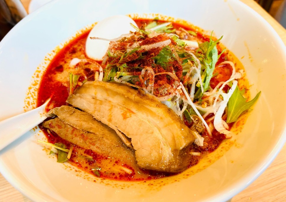 思っていたよりスパイス感が強くてエスニック、辛さは後ろからじんわり追いかけくる系で最後の方は心地良いヒリヒリ感を味わえました🍜