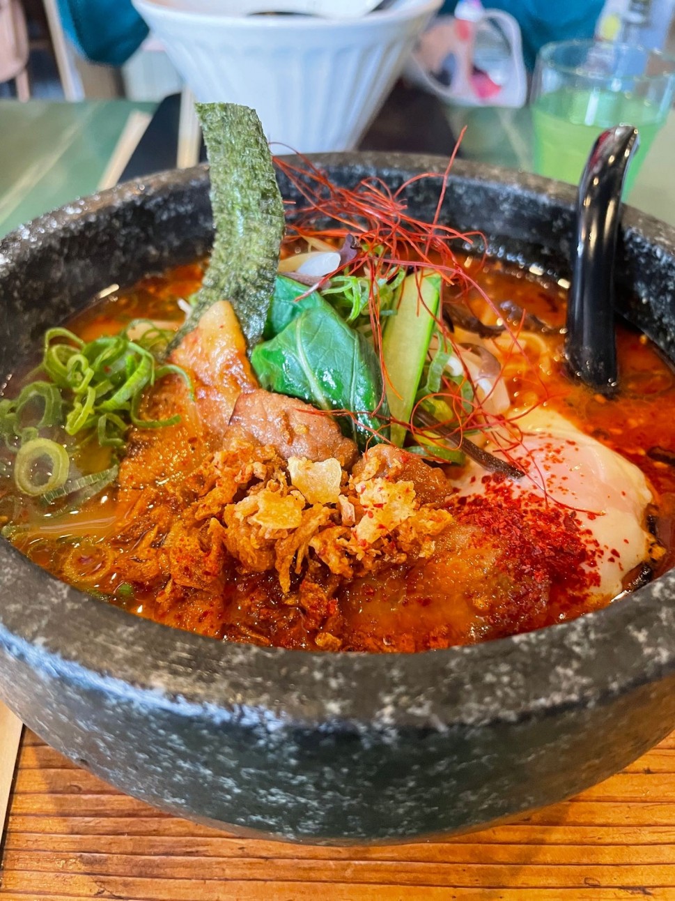 見た目がまず赤くて辛くて美味しそう〜湯気も出てて熱々石焼ラーメン🍜
