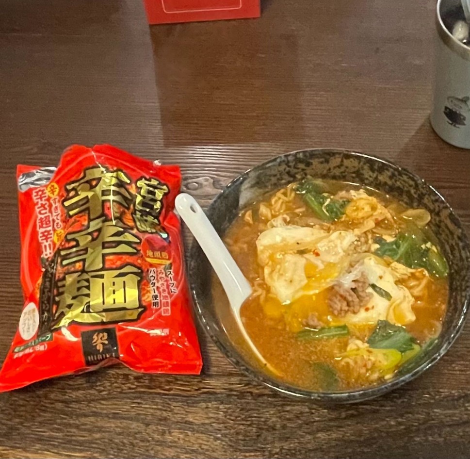 名前と見た目で辛いかなと思ったけど、インスタント麺の中でもそんなに辛くない方だと思います。唐辛子がところどころに入っててお肉を自分で出すならひき肉の方が美味しいと思います!チリペッパーとか足すのは必須!!