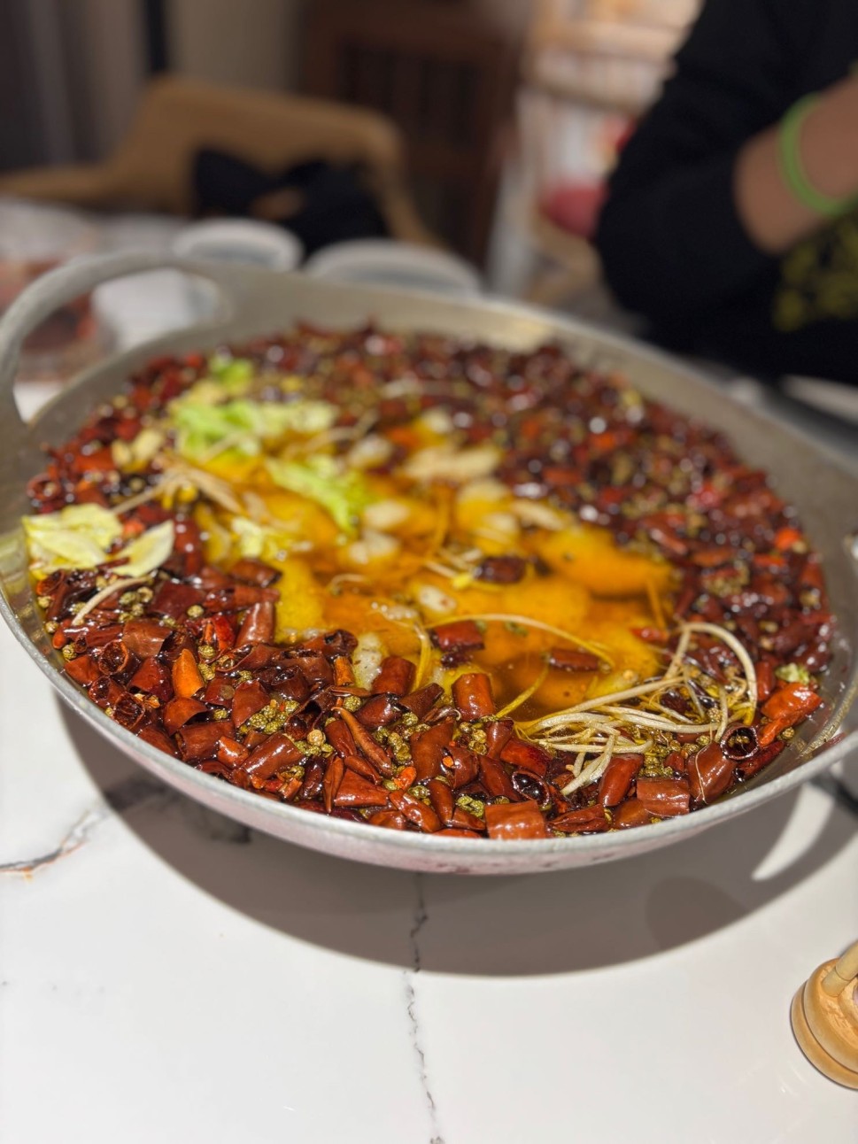 グツグツと煮えたぎる鍋がテーブルへ。グツグツが収まると店員さんが手早く鷹の爪と花椒を特殊なお玉で回収。