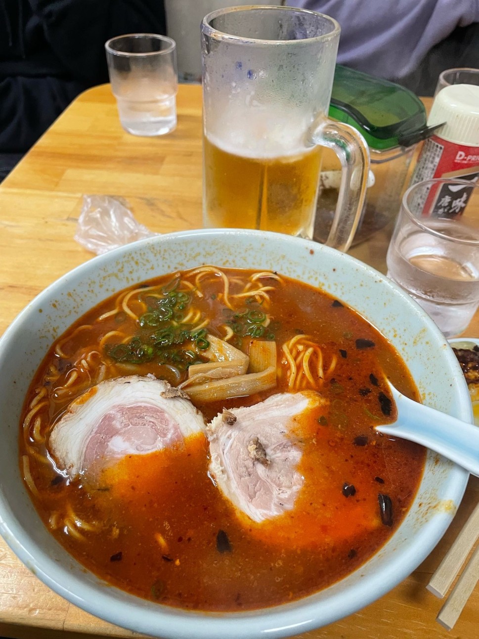 台湾ラーメンにとんこつってあるんだ、初めて知りました😊 極細麺ではなく、辛いスープのとんこつって珍しい感じ。さりげなく(?)写っている🍺がいいですね👍