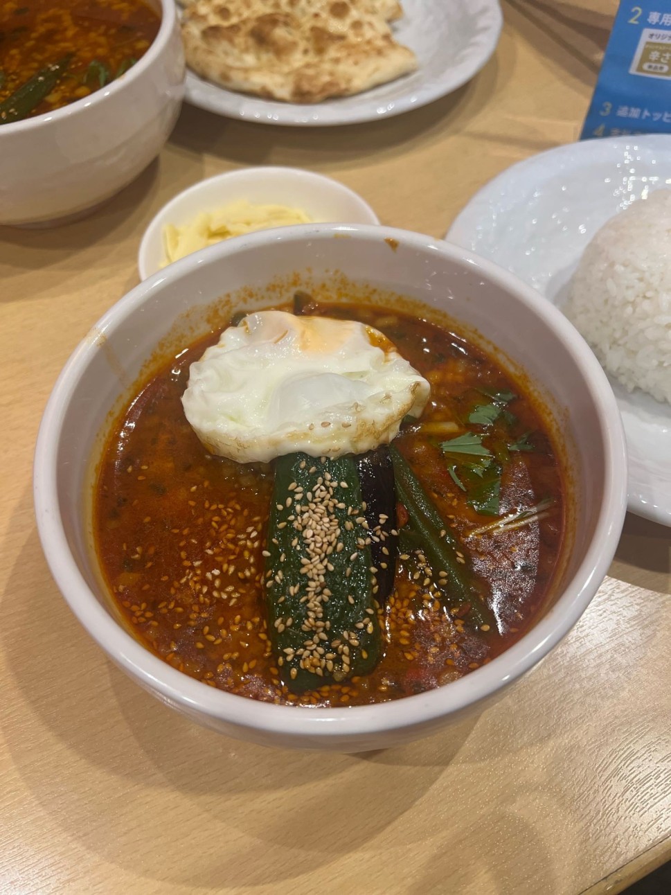 激辛カレーが食べたくて、渋谷のシャンティで辛さ50アルカロイドに挑戦❗️サラサラのスープに青唐辛子たっぷりでハンバーグもボリューミー✨二日酔いの胃にカレーが染みて最高でした(笑)スパイスが効いていて顔中滝汗が流れましたが、美味しくいただきました🫶