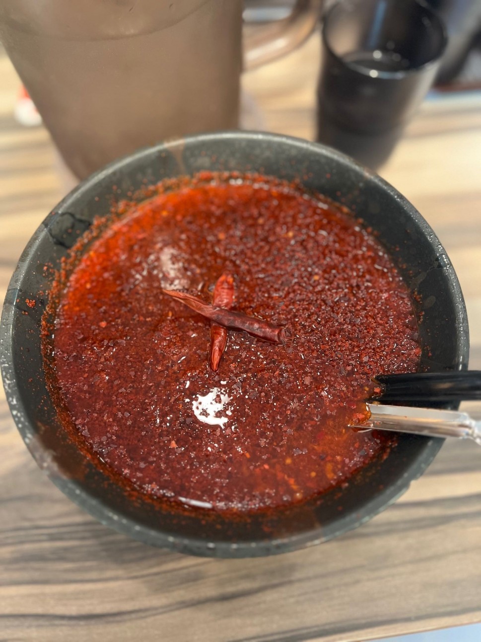 これ、大久保店で頼んだ時に完飲しましたが、腸が内側から焼かれるような、立っていられないレベルの激痛が来ました。 この料理は他のお店に比べて麺がかなり少ない上で、麺完食のみでのこのKMなので、辛さも完飲することにより4KM以上になると感じます。 辛さの種類としては、キャロライナリーパーとトリニダードスコーピオンで口全体に攻撃してきて、上に乗っている唐辛子は喉特化の小爆弾みたいな感じです。 これから完飲しようと思われている方は、いくら辛さに強い方でも、胃や腸などを守るために、絶対に薬を服用しましょう。