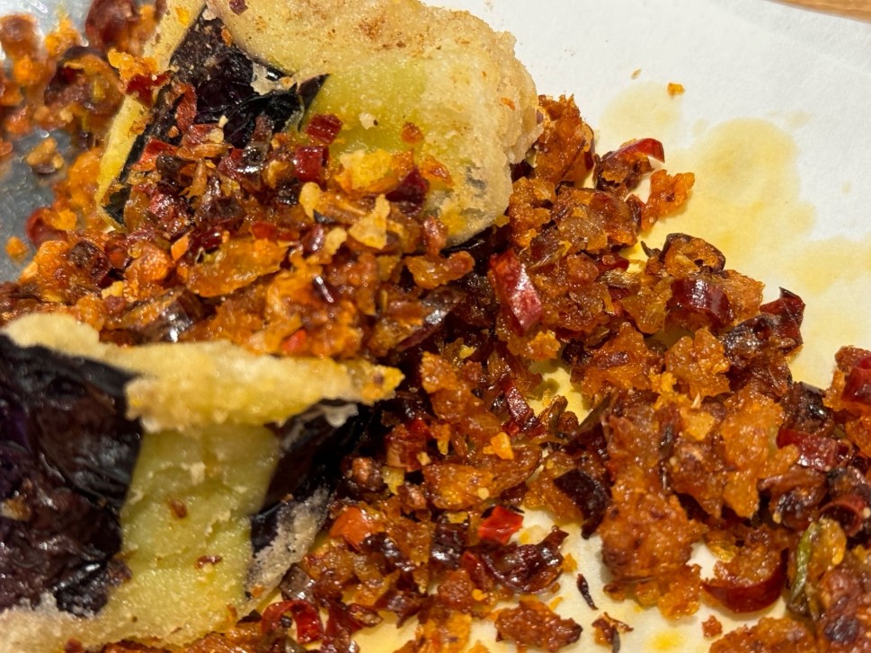 ネキとニンニクと輪切り唐辛子を揚げた薬味が最後に酒に合いまっせ😃