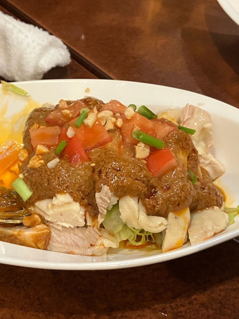 ゴマだれがたっぷりかかっていて、トマトとレタスが入ってます。はじめは辛さよりも胡麻の風味を感じ後からジワジワと辛さがきます!鶏もしっとりしていて美味しいです!