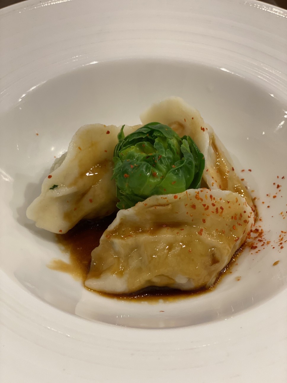 ラー油と一味の辛さがほどよい水餃子。