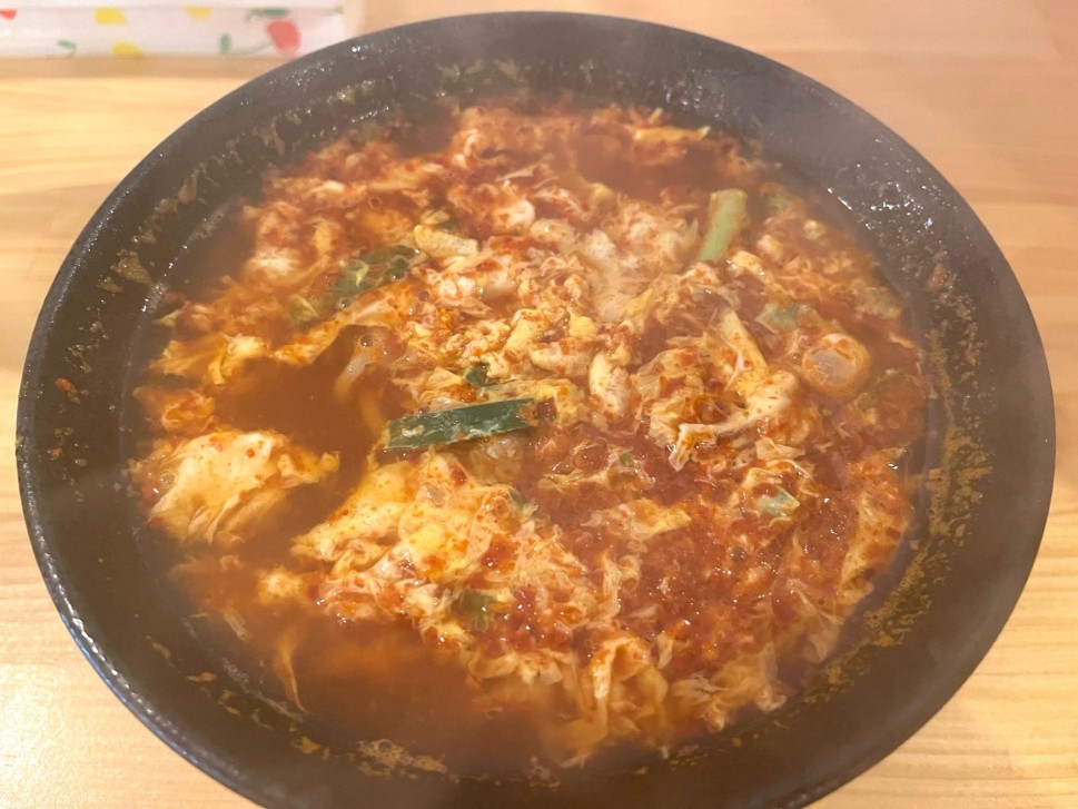 スープの中にいる唐辛子の量と辛さがあっていない感じ。たまごの量が多いんですかね。
