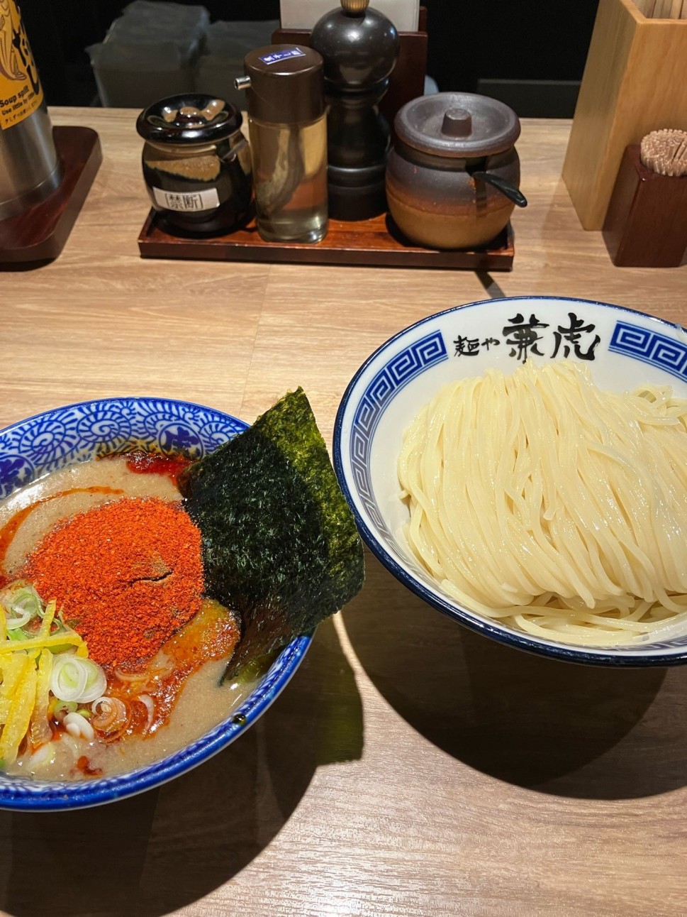 辛辛つけ麺に野菜追加。唐辛子の山に見えますが、下は魚粉です。