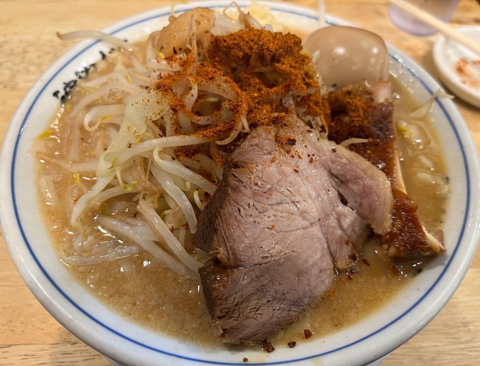 二郎系らしいコシのある極太麺、こってり濃厚豚骨スープ、分厚く柔らかいチャーシュー、シャキシャキもやし、ジワっと汗の出る辛さ、ボリューム満点満足の一杯でした。