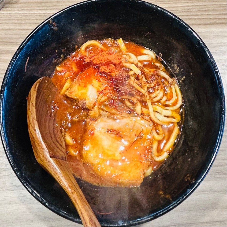 チャーシューの旨みが溶け出したようなスープは少し洋風っぽくて、甘味もあって、モチモチの太麺が絡んで、まるでミートソースみたい!もちろん、ライスに合う!!!店主さんが気さくに声かけてくれて辛さ足してもらった♪