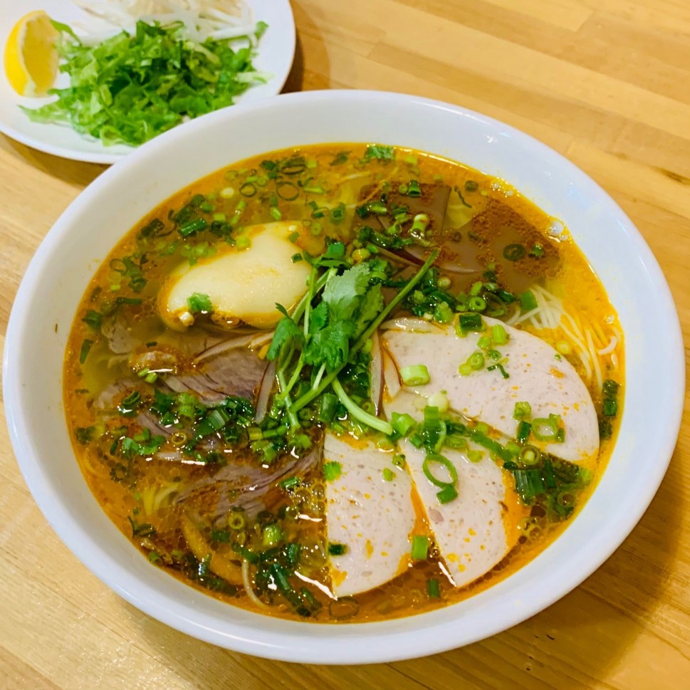 辛い麺料理はこれだけというので、辛さには期待せずオーダー。「フエ地方風の牛肉汁ビーフン」という意味だそうで、ビーフンは(この店では)細麺。スープはすっきり、あっさりしていて、ただ牛肉の甘みとコクはある。具の腸詰めや豚足が楽しい。750円。