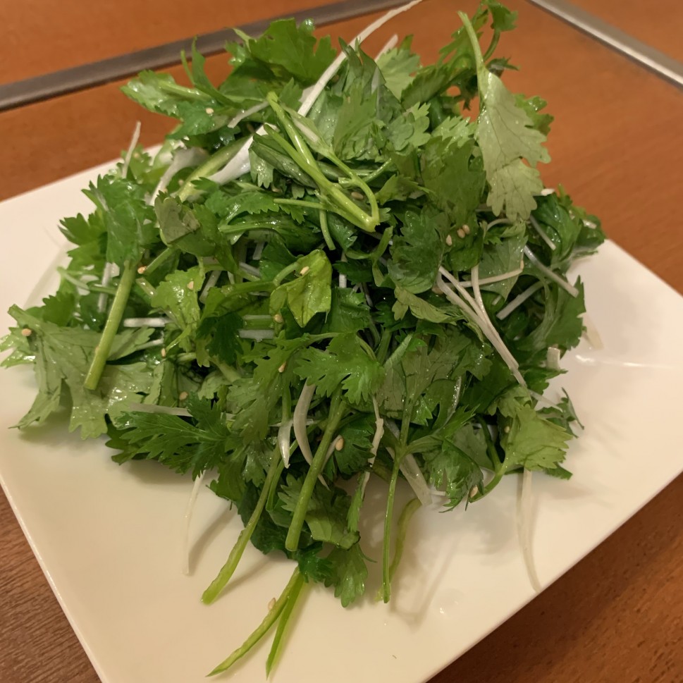 中国、延辺という朝鮮族が多く住む地域の料理。メニューは韓国料理と中国料理がミックスしていておもしろかった、このメニューは香菜(パクチー)と青唐辛子の和えもの。甘酸っぱいタレで辛くはなかった。